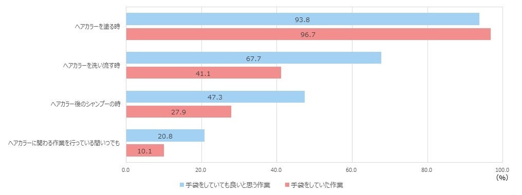 ・「ヘアカラー後のシャンプーの時」では、全世代平均にて「手袋をしていても良い」と「手袋をしていた」の間で、19.4%の差が見られている。