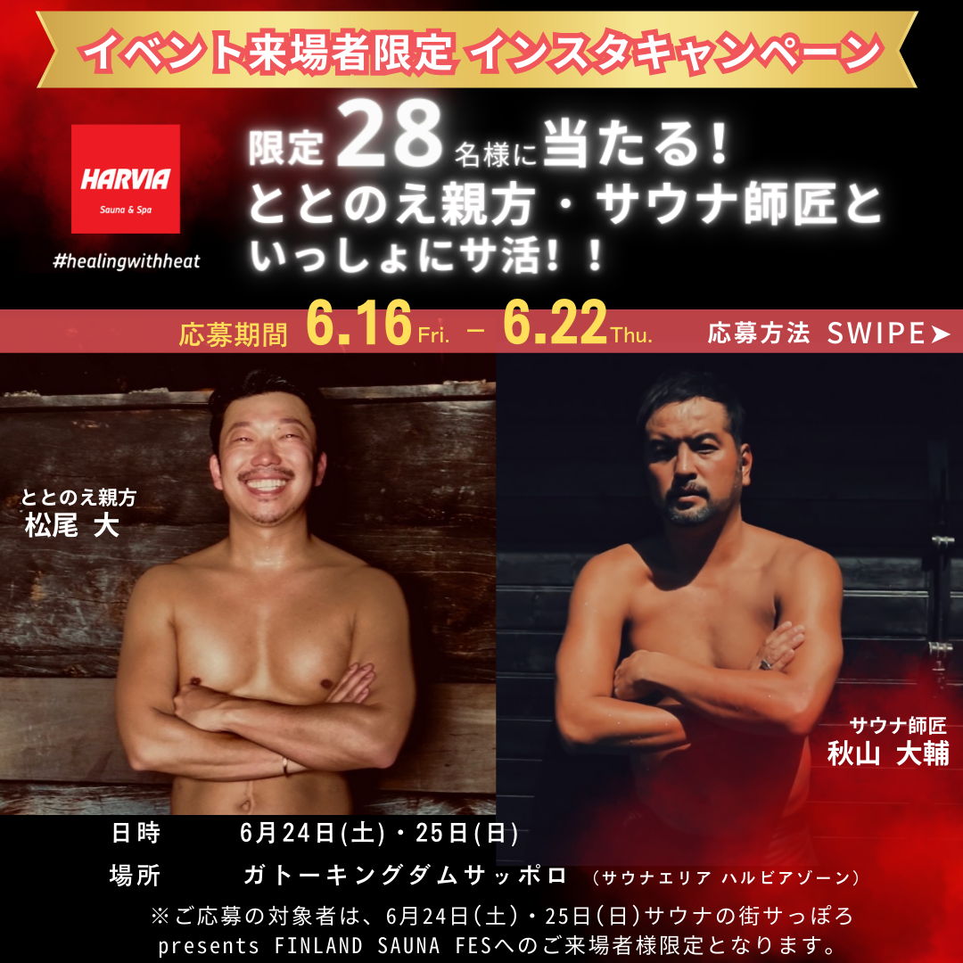 ハルビア札幌ショールーム公式インスタグラム(@harvia_sapporo)では、「ととのえ親方&サウナ師匠と一緒にサ活!キャンペーン」(抽選で各日限定14名計28名に当たる)を実施中!ぜひご応募ください。
