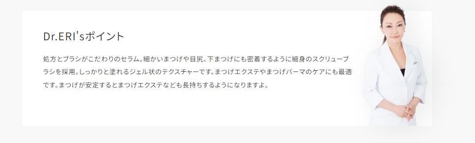 開発者である衣理クリニック表参道 統括院長 片桐衣理こと、Dr.ERIは、日々の診療を通して、患者様から”まつ毛が薄く細くなってきた、抜けやすい、マスカラを塗ってもコシが得られない”など、まつ毛にまつわる様々なお悩みを聞き、健やかなまつ毛を日々のスキンケアから育みたい、クリニックレベルの満足感を感じていただきたいという想いから開発。その効果実感の高さから、発売以来、ロングセラーアイテムとして、多くのお客様に愛されています。