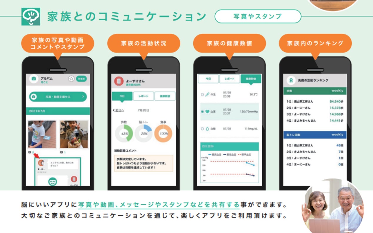 『家族サイト』は、認知症予防に焦点を当てた健康維持アプリ「脳にいいアプリ」と、そのご家族が繋がることができるWebサービスです。アプリを使っている方の健康状況を把握するだけでなく、写真、動画、メッセージ、スタンプ、家族間の歩数ランキングなどを通じて、心地よいコミュニケーションを可能にします。これにより、家族間の健康推進と共に、家族間の絆を深めることを目指しています。