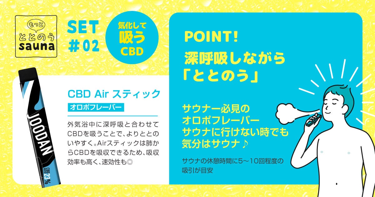JOODAN CBD Airスティックは、液体状のCBDを気化させ、水蒸気としてCBDを摂取する「吸う」CBD製品です(※2)。7フレーバーある本製品のうち、サウナにおなじみの「オロポ」フレーバーをセットにしております。外気浴中に深呼吸と一緒にお楽しみいただけます。また、サウナにけない時でも、CBDのリラックス効果でサウナ後にオロポを飲みながらリラックスしているような気分になれます。