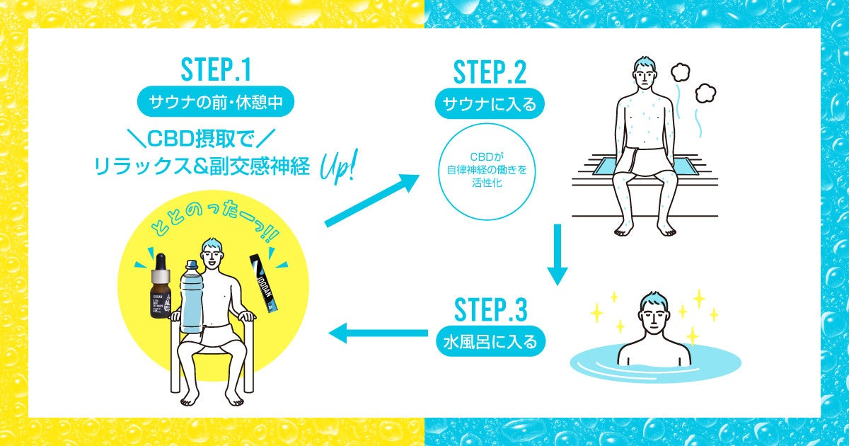 JOODAN CBD ととのいセットをより効果的に使用するためには、サウナ・水風呂・外気浴(温冷交代浴)を繰り返すことが大切です。サウナの前・休憩中にJOODANをお使いいただき、CBDを摂取していただくことでととのいをサポートいたします。