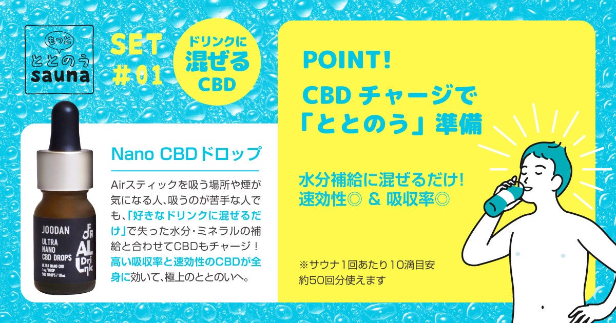 「JOODAN CBD ととのいセット」は、サウナでの水分補給時に最適なJOODAN ドリンク用Nano CBDドロップとサウナーの方なら誰もが知る「オロポ」フレーバーに仕上げたJOODAN CBD Airスティックをセットにした商品です。サウナで極上のととのいを味わうため、CBD製品の中でもより体感の得やすい摂取方法を組み合わせた2商品をセットにいたしました。