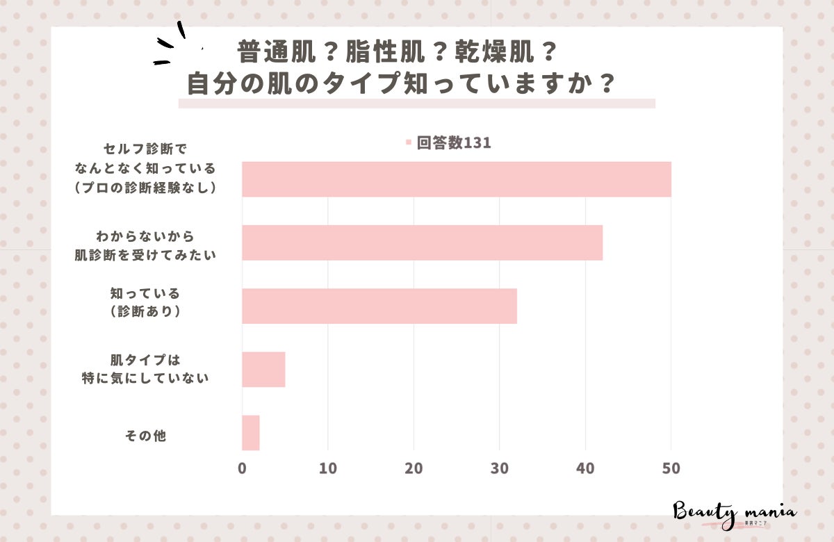 「普通肌?脂性肌?乾燥肌?自分の肌のタイプ知っていますか?」とアンケート調査した結果、1位は『セルフ診断でなんとなく知っている(プロの診断経験なし)(50人)』、2位は『わからないから肌診断を受けてみたい(42人)』、3位は『知っている(診断してもらったことあり)(32人)』となっています。