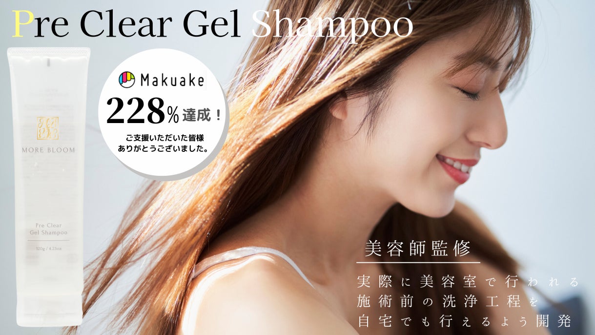 MORE BLOOMより開発されたモアブルームプレクリアジェルシャンプーは、先行販売として応援購⼊サービス「Makuake(マクアケ)」にて販売開始後24時間以内に目標金額を達成し、プロジェクト終了時は目標金額228%を達成しました。