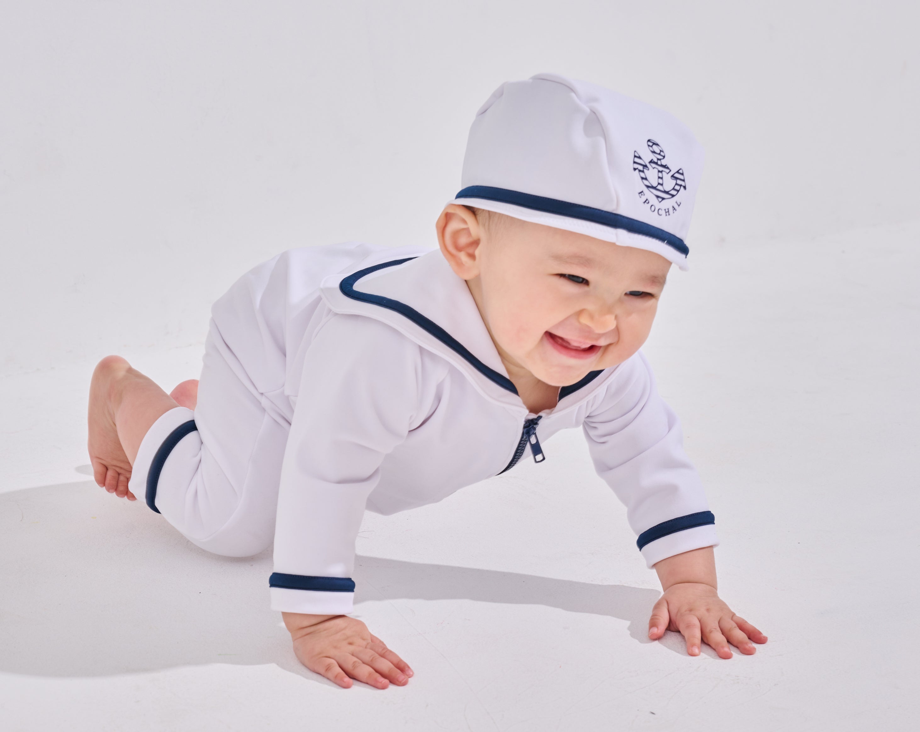 マリンスタイルのカバーオールタイプは、脱着も楽であると同時に、身長90㎝の時には長丈タイプで着用し、歩き始めて水遊びを楽しめるようになる100㎝頃には、動きやすい七分丈で着用できる。0歳から3歳くらいまで使えるコスパの良さで、出産祝いなどでも人気の製品。