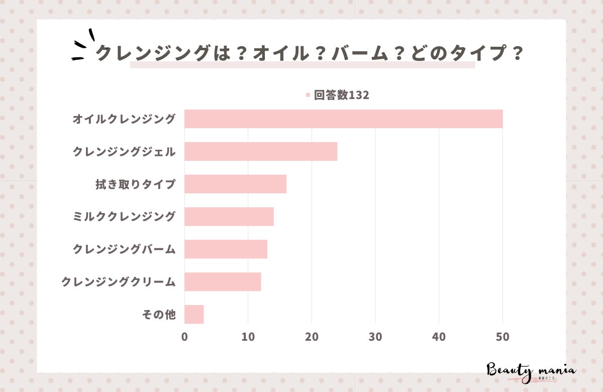「クレンジングは?オイル?バーム?どのタイプ?」とアンケート調査した結果、1位は『オイルクレンジング(50人)』、2位は『クレンジングジェル(24人)』、3位は『拭き取りタイプ(16人)』となっています。