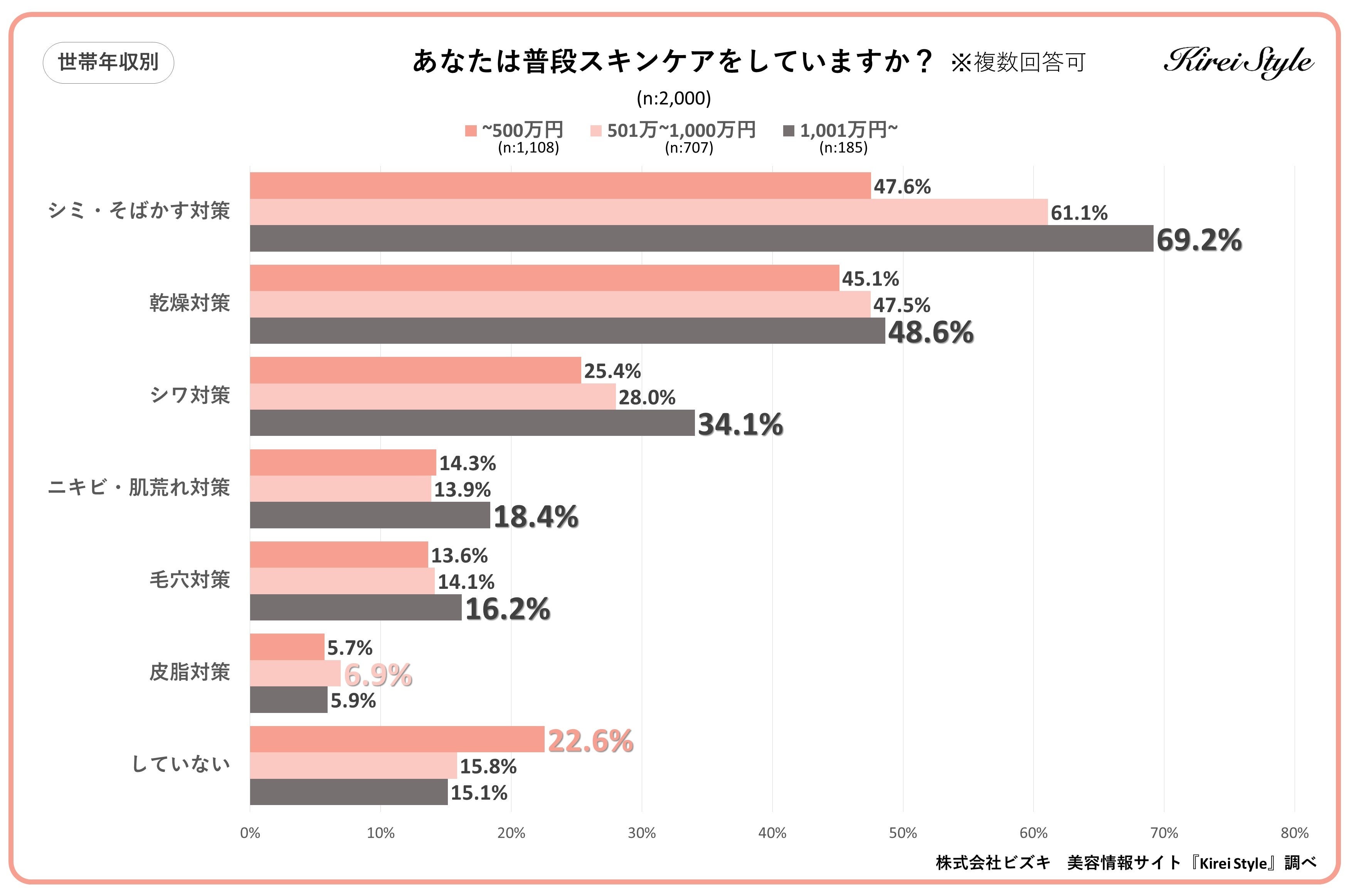 この結果から、世帯年収が高い方はスキンケアにお金をかけている傾向があると考えられます。
