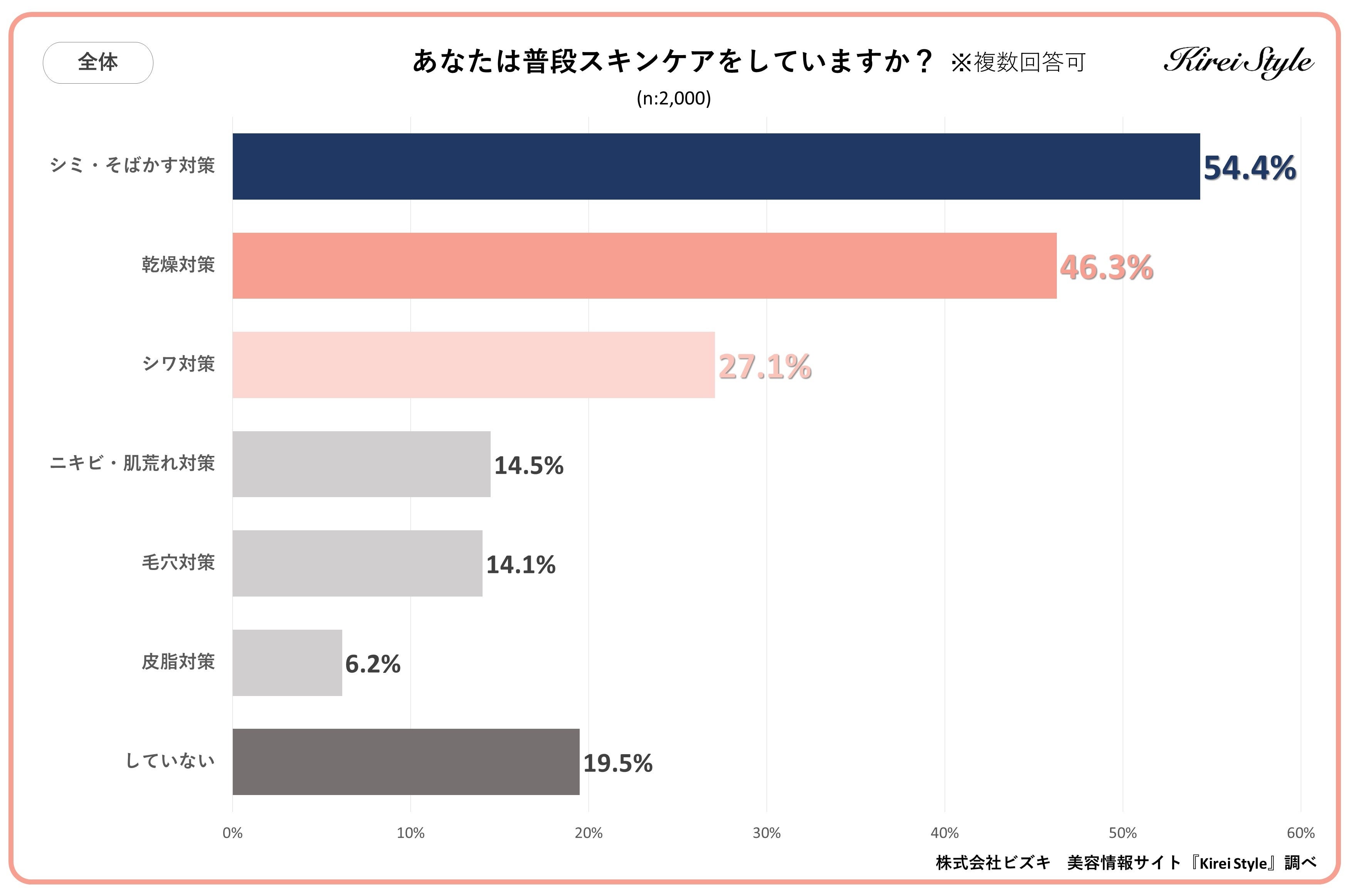 全国の女性2,000人を対象に「あなたは普段スキンケアをしていますか?」というアンケートを実施したところ、「はい(シミ・そばかす対策)」という回答が最も多く、54.4%となりました。次いで「はい(乾燥対策)」が46.3%、「はい(シワ対策)」が27.1%と続きました。また、「スキンケアをしていない」という回答も意外と多く、19.5%という結果が得られました。