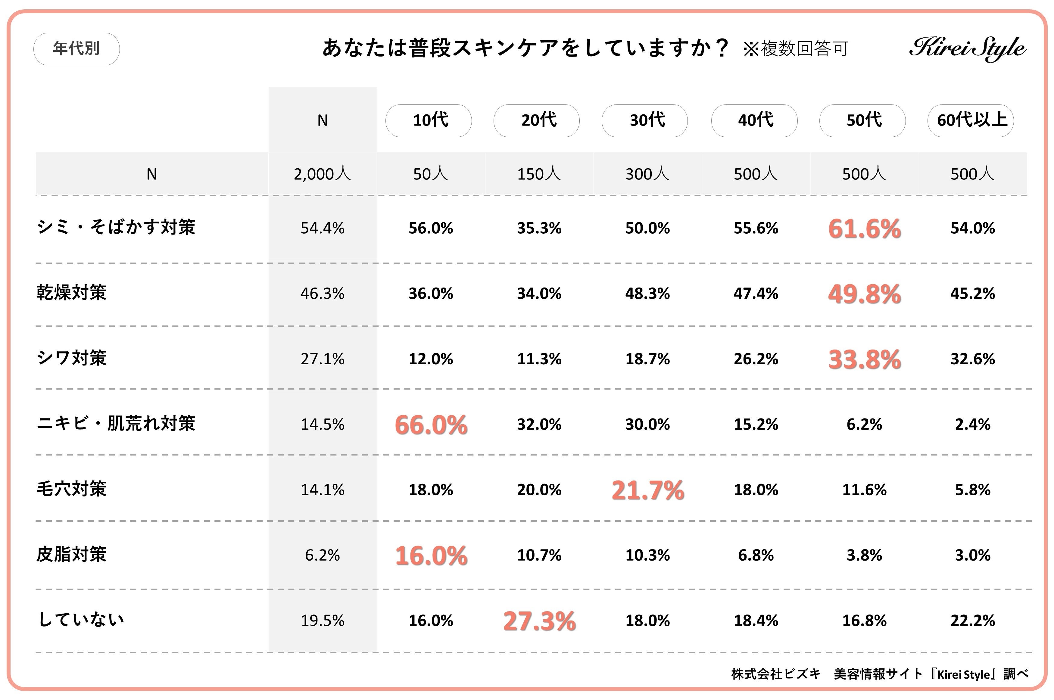 さらに回答項目ごとに確認すると、年代ごとに肌悩みの傾向が変化しているということが分かります。「ニキビ・肌荒れ対策」「皮脂対策」は10代、「スキンケアをしていない」は20代、「毛穴対策」は30代、「シミ・そばかす対策」「乾燥対策」「シワ対策」は50代の回答率が最も高くなりました。