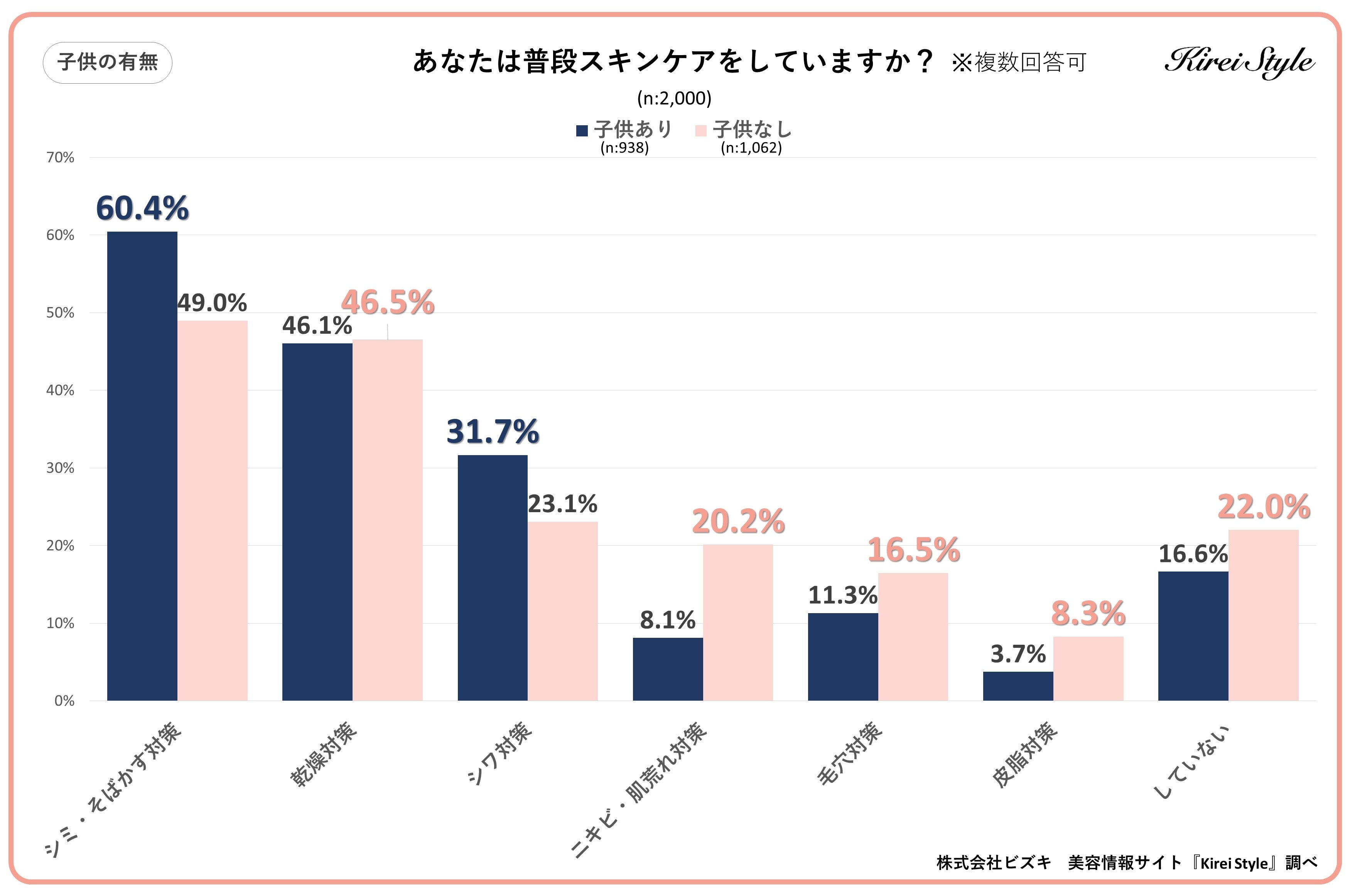 子供の有無で見てみると、「乾燥対策」「ニキビ・肌荒れ対策」「毛穴対策」「皮脂対策」「スキンケアをしていない」の項目においては、子供なしの方の回答率の方が高く、「シミ対策」「シワ対策」の項目においては、子供ありの方の回答率の方が高いことが分かります。