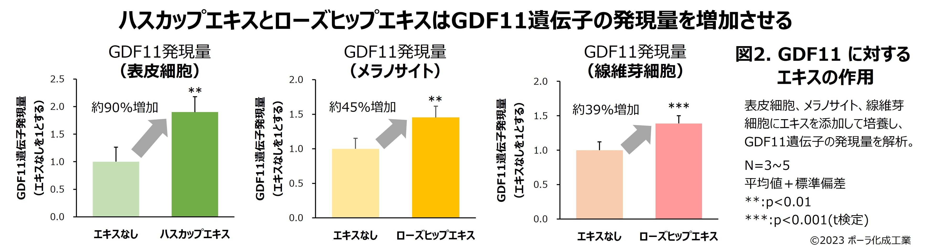 各細胞においてGDF11発現量を増やすことができれば、複数の皮膚老化の予防につながると考えられます。そこで皮膚を構成する細胞3種にさまざまなエキスを添加し、GDF11の発現量を増加させるものを探索した結果、ハスカップエキスおよびローズヒップエキスにその作用を発見しました(図2)。
