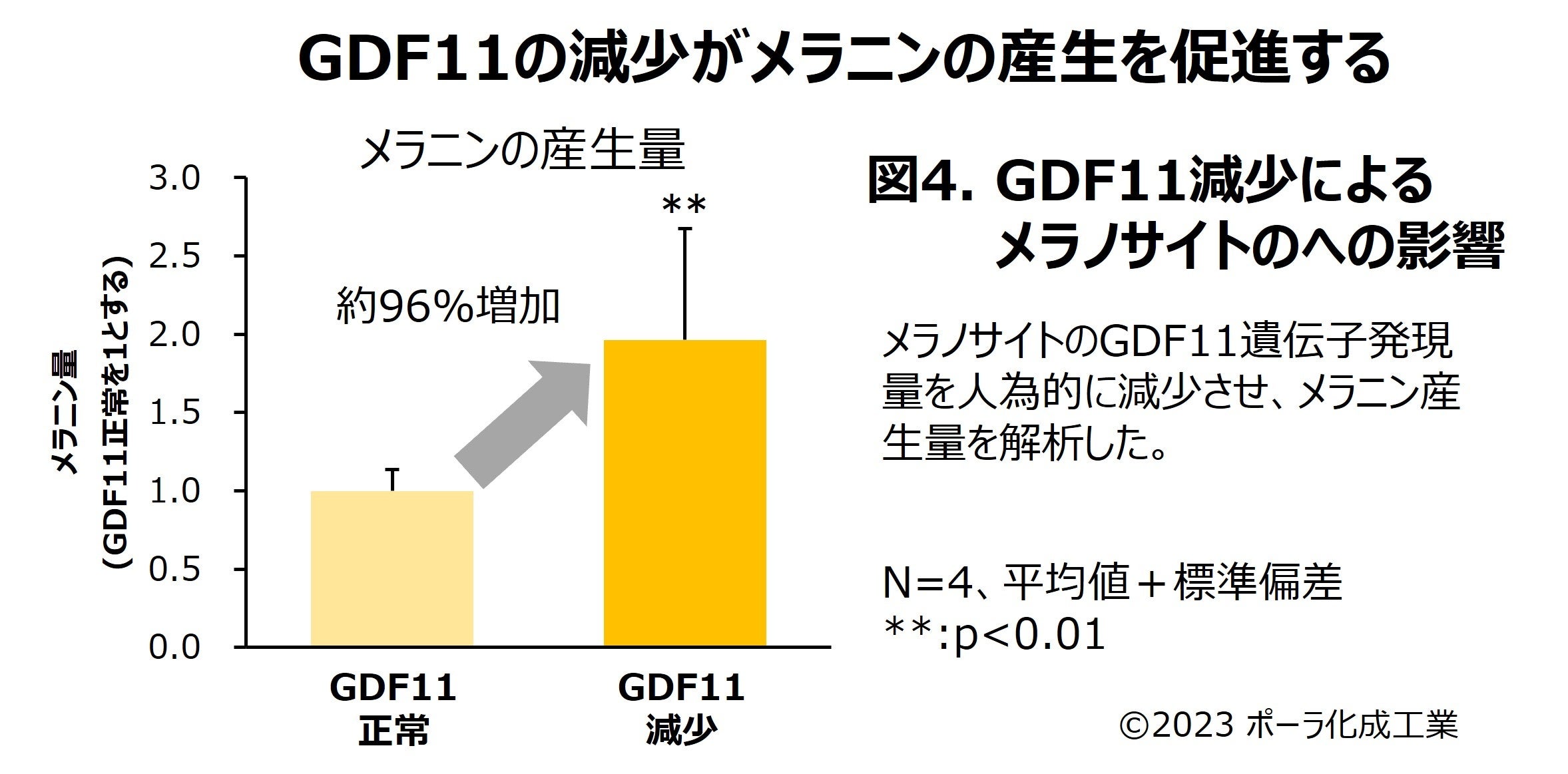 メラニン色素を作る細胞、メラノサイトにおいてもGDF11遺伝子の発現量を人為的に減少させると、メラニン色素の産生量が増加しました(図4)。