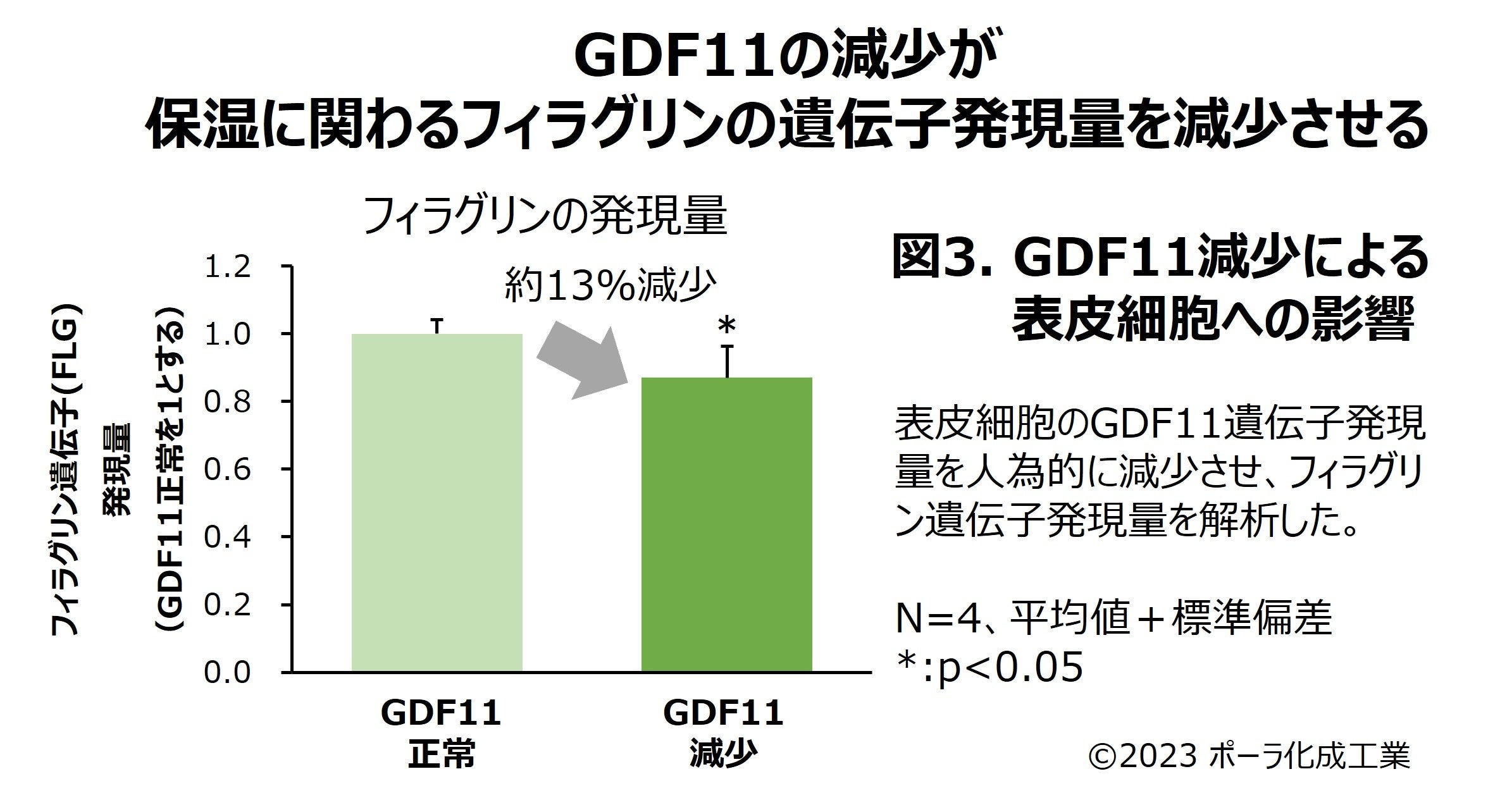 皮膚表面の表皮角層を形成している表皮細胞においてGDF11遺伝子の発現量を人為的に減少させる(※1)と、角層のうるおい保持に重要なタンパク質、フィラグリン(※2)の遺伝子発現量が減少しました(図3)。