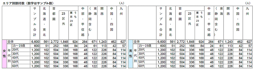 ※男女それぞれ、年齢5歳刻みで均等割付(エリアと年代による割付数詳細は下記数表を参照)
