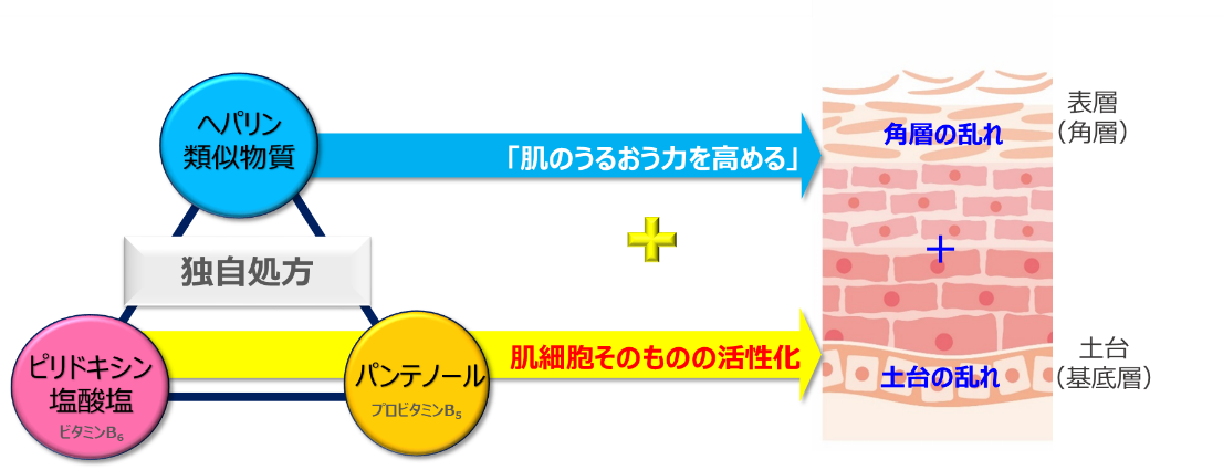 肌みずからがうるおう力を再生する「ヘパリン類似物質」に加え、肌細胞を活性化するWビタミン「パンテノール(プロビタミンB5)」「ピリドキシン塩酸塩(ビタミンB6)」を配合しています(図1)。