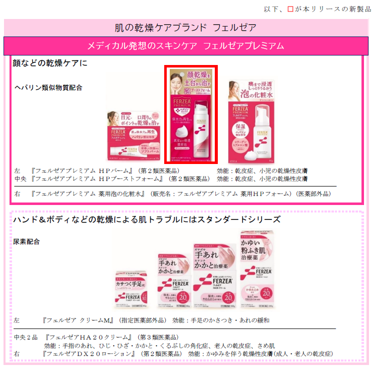 『フェルゼア』は1988 年に“肌の乾燥治療薬”のブランドとして生まれました。乾燥肌の治療成分として長年医薬品に使用されてきた「ヘパリン類似物質」を配合した『フェルゼアプレミアム』シリーズは、2021年9月発売後、乾燥が気になる方にご使用いただいています。