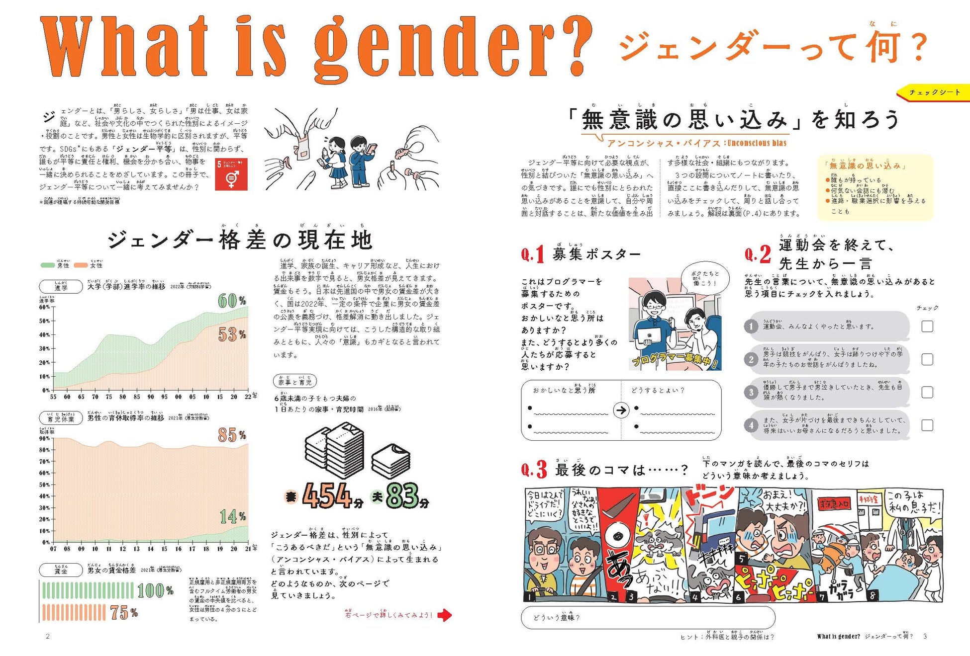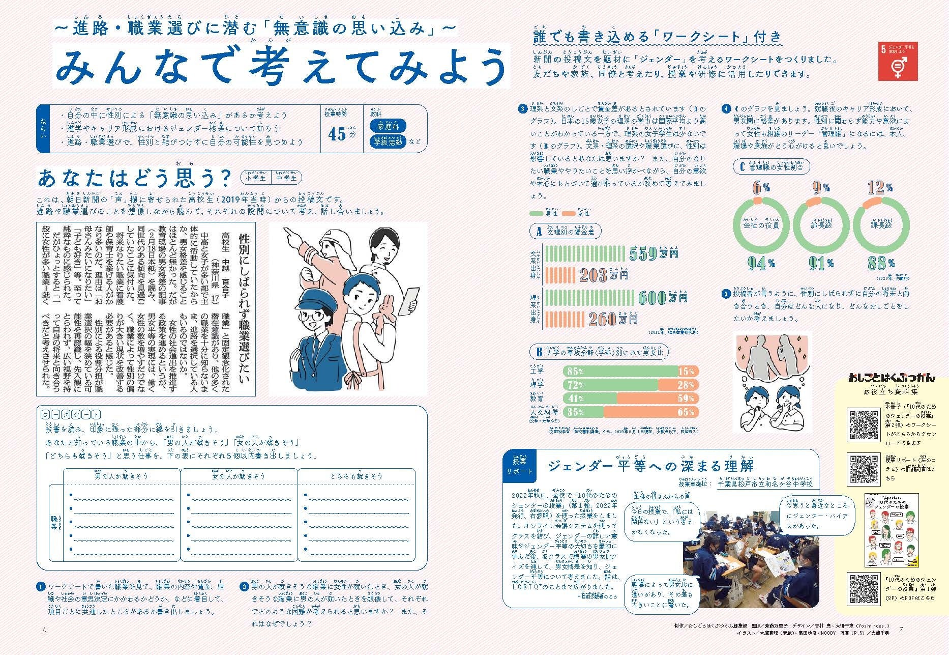 「10代のためのジェンダーの授業」冊子は、昨年第一弾を作成し、ジェンダー平等教育が求められる教育現場から大きな反響をいただきました。昨年(2022年7月)「女性の職業生活における活躍の推進に関する法律」が制度改正され、「男女の賃金の差異」が情報公表の必須項目になるなど、日本のジェンダー平等に関する状況は日々変わっています。第二弾となる今年の冊子は、性別にもとづくアンコンシャス・バイアス(無意識の思い込み)の影響についても紹介。これからの未来を担う10代の小・中学生が将来を決める際、「女子は理系より文系」、「これは男 or 女の仕事」「女だから or 男だから難しい」といった、無意識の思い込みに左右されず、誰もが能力と個性を発揮できる社会をつくるための気づきとなるような、データによる現状の解説や、新聞の投稿文を題材にしたワークシートも作成いたしました。