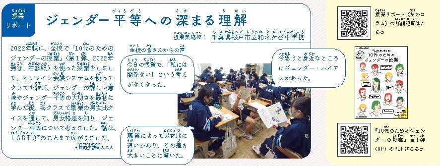 昨年、「10代のためのジェンダーの授業」冊子を、「おしごと年鑑2022」に同梱し、全国の小・中学校約3万校に寄贈したところ、多くの学校から「もっと活用したいから追加で送ってほしい。」という声がよせられ、要望のあった学校に追加寄贈しました。今回の第二弾冊子には、追加希望先の一つ、松戸市立和名ケ谷中学校の授業リポートも掲載。「すべての生徒、先生と理解を深めたい」と、性の多様性についても話を広げながら、全クラスに授業を展開していただきました。