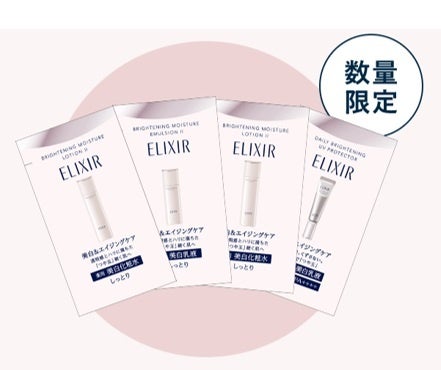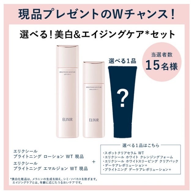 ※対象商品:エリクシール スポットクリアセラム WT(医薬部外品)/エリクシール ホワイト クレンジングフォーム(医薬部外品)/エリクシール ホワイト スリーピング クリアパック(医薬部外品)/エリクシール デーケアレボリューションSP+(医薬部外品)/エリクシール ブライトニング デーケアレボリューションWT+(医薬部外品)