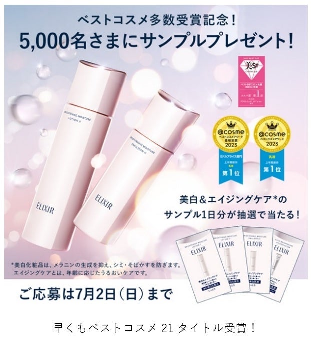 発売4ヵ月で100万本※1の売上を突破!エリクシール 美白※2&エイジングケア※3の化粧水・乳液が上半期ベストコスメを多数受賞!今だけ限定のキャンペーンを開始。