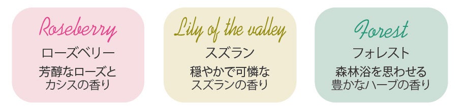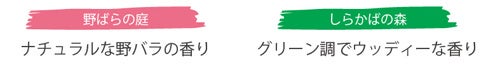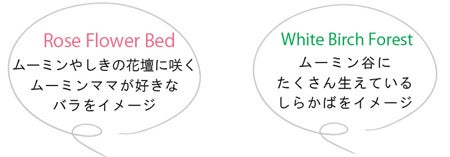 ムーミンやしきの花壇に咲くムーミンママが好きなバラをイメージした「野ばらの庭」と、ムーミン谷にたくさん生えているしらかばをイメージした「しらかばの森」の2つの香りが楽しめます。