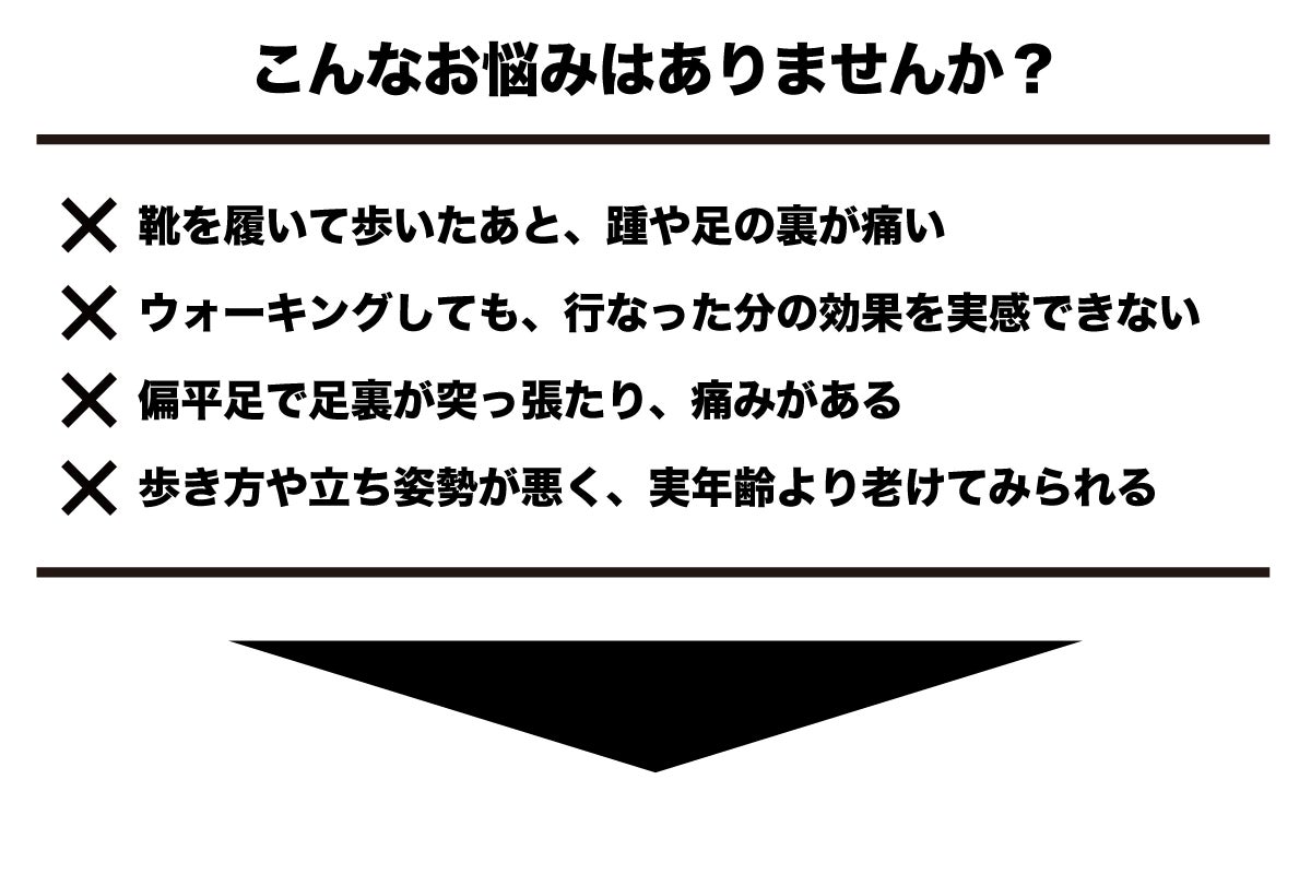 足の裏がひらたく、土踏まずの高さがほとんどない状態(扁平足)は、本来身体に備わっているはずのアーチ=“クッション”が機能しないことで、長時間歩いたり立ち続けたりした際に、必要以上の疲れを感じたり、足の裏が突っ張るように痛んだり、さらに「外反母趾」「つりやすい」「足の裏に炎症が起きる」「姿勢が悪くなる」「転びやすくなる」などなど多くの弊害を引き起こす可能性があります。