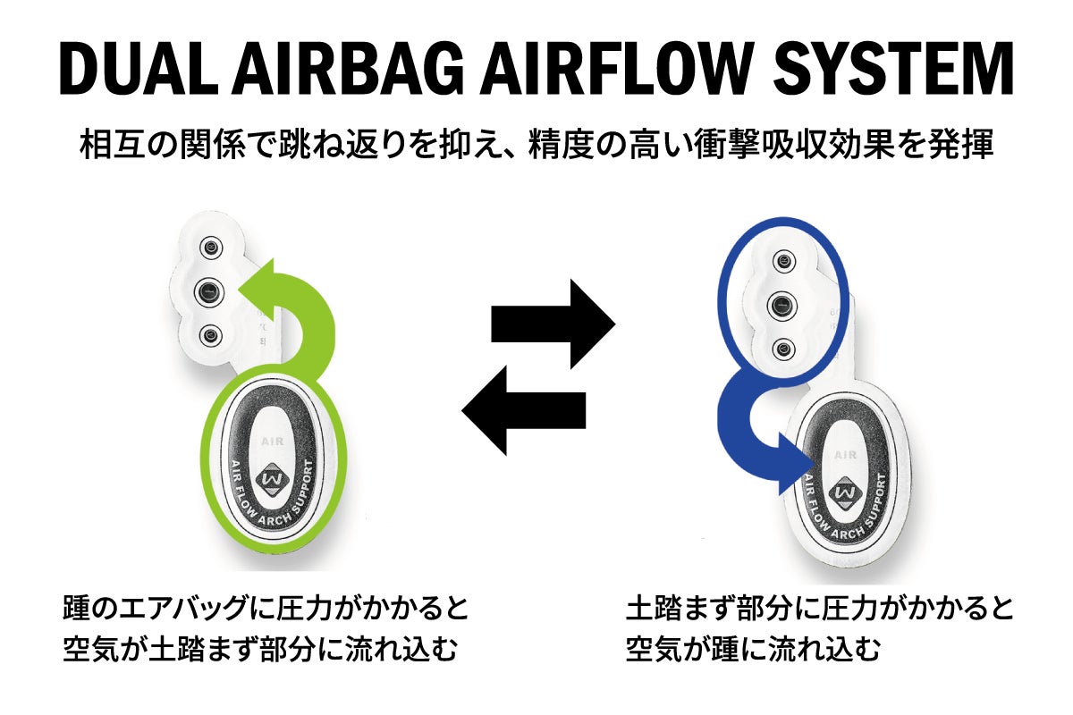 デュアルエアバッグは、足裏の踵とアーチ部分を連結したエアバッグです。歩行時に踵のエアバッグに圧力がかかると、空気がアーチ部分に流れ込みます。逆に、アーチ部分に圧力がかかると、空気が踵に流れ込みます。この相互の関係によって、足への衝撃を吸収し、跳ね返りを抑えます。