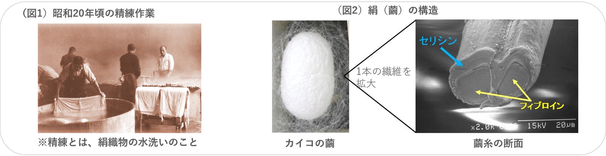 総合繊維メーカー発のエイジングケア化粧品ブランドで、ピュアセリシン™を高配合しております。祖業の精練(図1)に携わる職人の手は、厳しい水仕事にもかかわらず、いつも白く輝いていました。当社はこの秘密が、絹に含まれるタンパク質セリシン(図2)であることを突き止め、「ピュアセリシンTM」を開発しました。