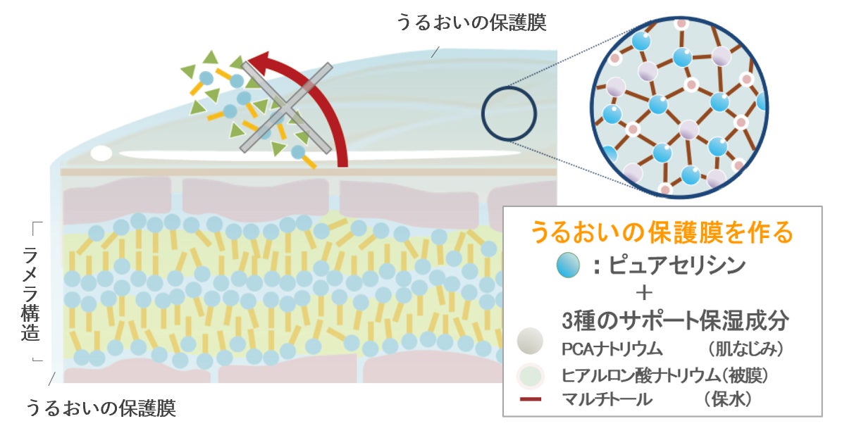 ピュアセリシン™と3種のサポート成分が結びついて、うるおいの保護膜を作ります。保護膜によって洗顔によって流されやすい肌にうるおいを保持する「ラメラ構造」を守り、次に使用するスキンケアの浸透※2を高めます。
