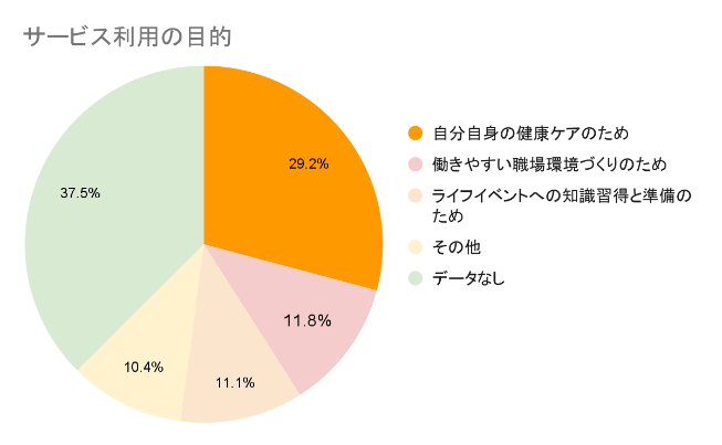 全体の利用者傾向としては、管理職以外のユーザー利用が多く、サービス利用目的としては、「自分自身の健康ケアのため」「働きやすい環境づくりのため」が上位を占めました。