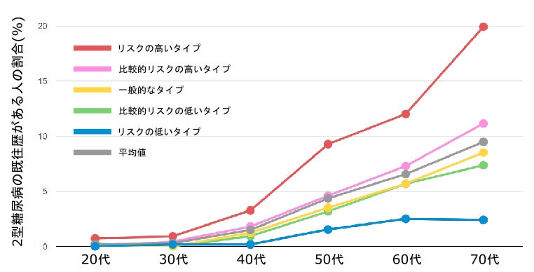 『2型糖尿病』の項目では、「リスクの高いタイプ」「比較的リスクの高いタイプ」「一般的なタイプ」「比較的リスクの低いタイプ」「リスクの低いタイプ」と健康リスクに合わせて5つのタイプに分けています。それぞれのタイプにおける2型糖尿病の既往歴がある人の割合、つまり、どの年代でどの程度の割合で2型糖尿病にかかっていたかを年代別にみると、「リスクの高いタイプ(図:赤色)」の場合、50代で約10%、70代で約20%ですが、「リスクの低いタイプ(図:青色)」の場合、50代で約2%、70代でも3%未満です。同じ年代でもタイプによってリスクが大きく異なることが、以下のグラフから見て取れます。