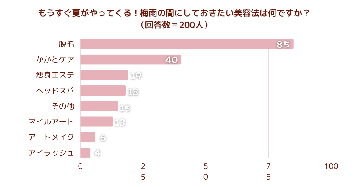 「もうすぐ夏がやってくる!梅雨の間にしておきたい美容法は何ですか?」とアンケート調査した結果、1位は『脱毛』でした。