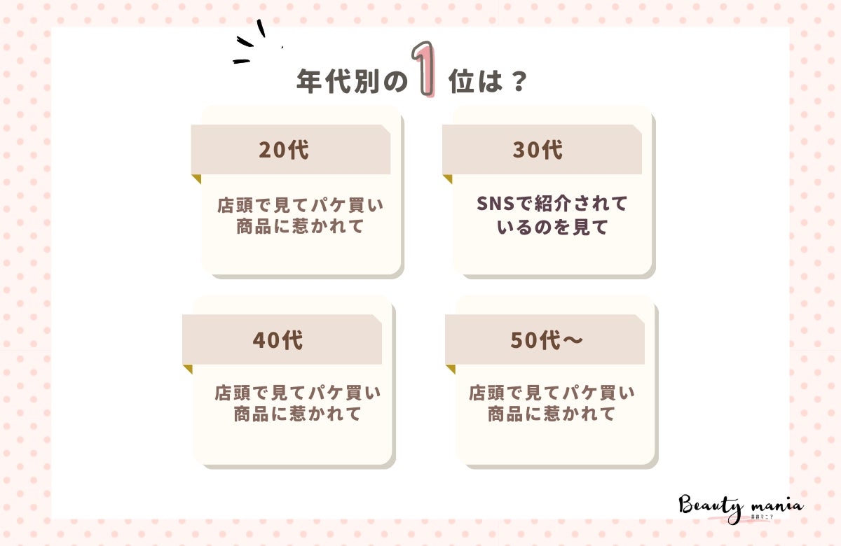・店頭でテスターを使って試したり、値引きされていたり、サンプルがついていたりすると、つい買ってしまいます。(50代〜)