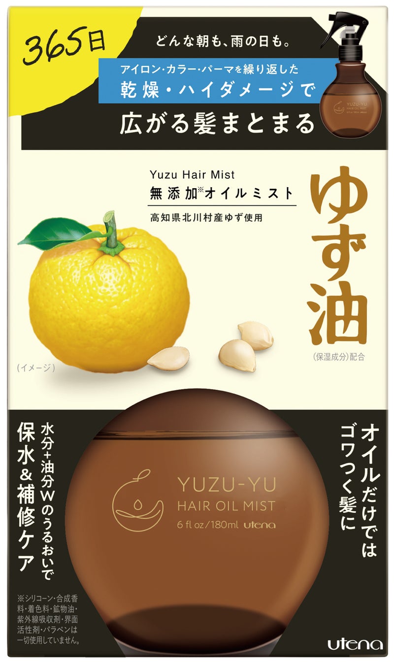 商品説明 : 乾燥・ハイダメージで広がる髪に。水分+油分Wのうるおいで保水&補修ケアして、広がる髪も毛先までしっとりまとまる無添加※オイルミスト。爽やかな天然ゆずの香り。(※シリコーン・合成香料・着色料・鉱物油・紫外線吸収剤・界面活性剤・パラベン 全て不使用)