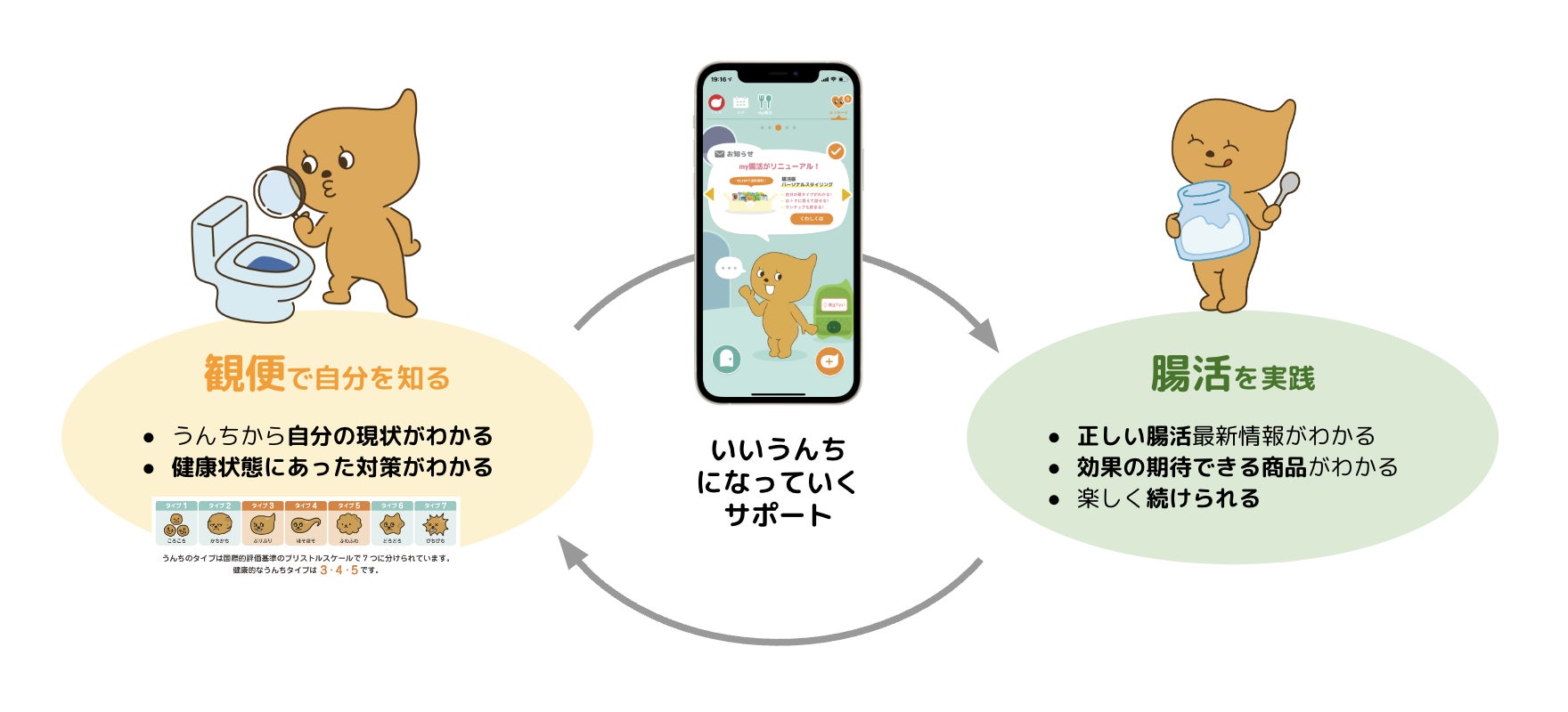 うんちを観察する”観便”と腸内環境を整える”腸活”で、健康管理をサポートする腸内環境改善プラットフォームです。うんちを活用した健康の数値化、それぞれのタイプにあわせた腸内環境改善ソリューションを提供しています。うんちにエンターテイメントとテクノロジーを掛け合わせ、誰でも楽しみながらかんたんにお腹の中からすっきりできるサポートをするヘルスケアアプリです。