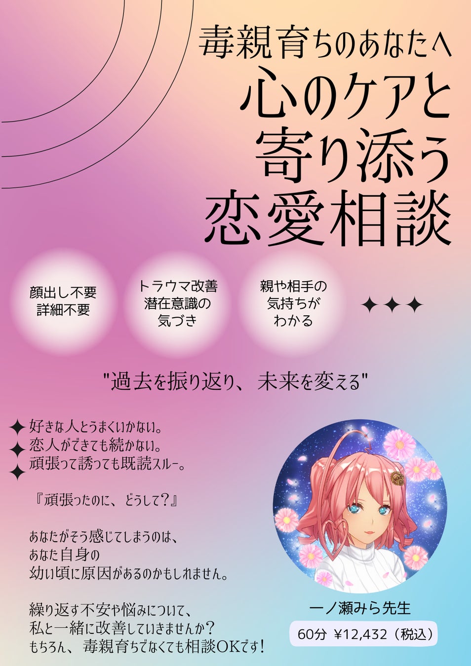 このキャンペーンは、過去のトラウマや繰り返される恋愛の不安に悩む方々が、一ノ瀬みらさんの27年にわたる鑑定経験を通じて改善の手助けを受けられるサービスです。毒親育ちでなくても、さまざまな恋愛の悩み相談に対応しています。
