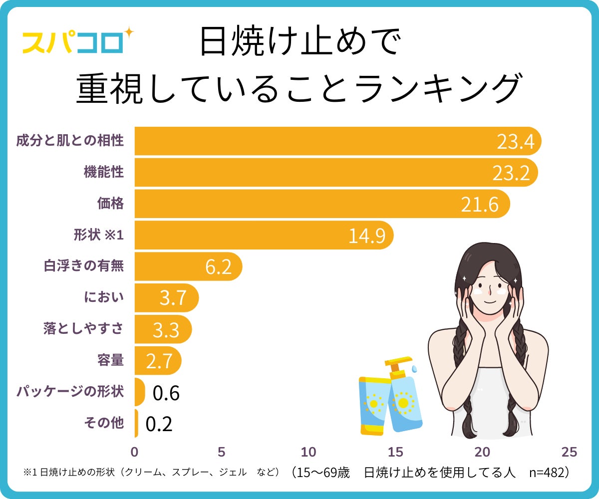 日焼け止めで最も重視していることは「成分と肌との相性」(23.4%)、「機能性」(23.2%)、「価格」(21.6%)、「日焼け止めの形状(クリーム、スプレー、ジェルなど)」(14.9%)、「白浮きの有無」(6.2%)。