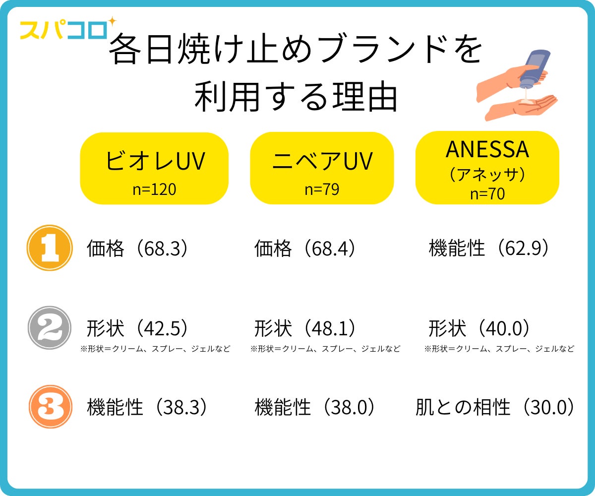 各ブランドを最も利用している人に理由を聞いたところ、「ビオレUV」と「ニベアUV」は同じく1位「価格」、2位「日焼け止めの形状(クリーム、スプレー、ジェルなど)」、3位「機能性」でした。