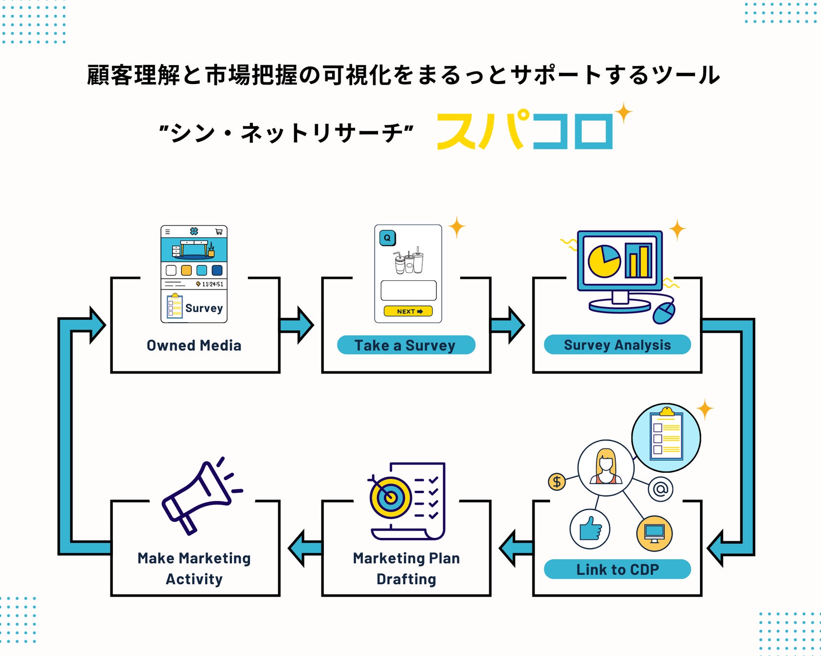モニタスが提供する『スパコロ』は、顧客理解と市場状況を可視化し、ワンストップでサポートするツールです。自社会員IDと紐付けたアンケート調査、さらに外部モニターと組み合わせたリサーチが可能になるため、企業側はより深い顧客理解や市場把握ができるようになります。さらに顧客側はポイントやプレゼントなどのメリットを受けられるので、活性化にも繋がります。