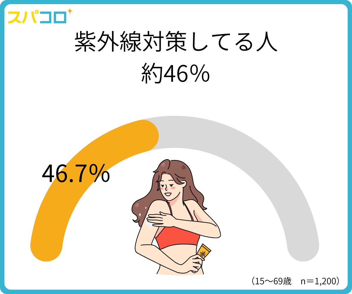 全国 15~69歳1,200名に聞いた「紫外線対策」の実施割合は「紫外線対策をしている」(46.7%)、「紫外線対策をしていない」(53.3%)でした。約半数の人が紫外線対策をしていることがわかる結果となりました。