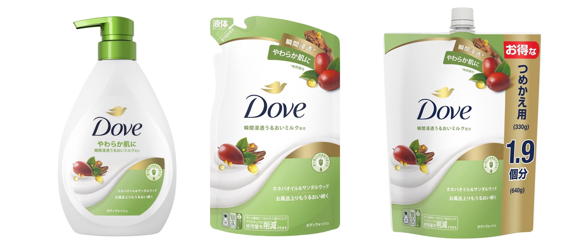 今回の大型リニューアルに際し、洗うだけで“やわらか肌”を叶える「ダヴ ボディウォッシュ ホホバオイル&サンダルウッド」が新登場します。瞬間浸透※1うるおいミルクに加え、オーガニックホホバオイルを配合し、身体をたっぷり保湿して思わず触りたくなるなめらかな“やわらか肌”を叶えます。上品で心やすらぐホホバオイルとサンダルウッドの香り(香料配合)に包まれながら、毎日のお風呂時間で至福のリラックスタイムをお過ごしください。