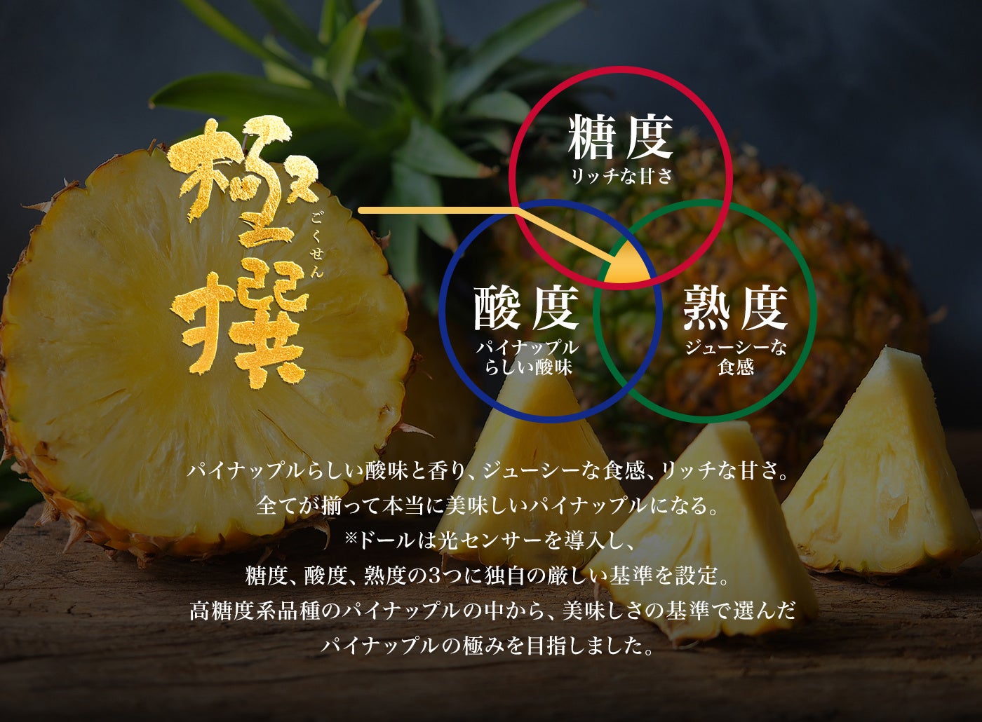 ドールはこれまでにも品質にこだわったパイナップルを発売しており、中でも今年20年目になったスウィーティオパインは長年多くの方から愛されてきました。今回、そんなスウィーティオパインで愛され、パイナップルを知り尽くしているドールだからこそ実現できるプレミアムパイナップル「極撰パイン」を販売します。