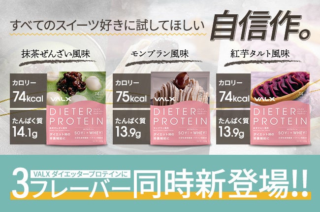「前例のない熱狂を、しかける。」をミッションに掲げるレバレッジは、ダイエット中でも甘いスイーツが食べたいという声にお応えして、VALXダイエッタープロテインから抹茶ぜんざい風味、モンブラン風味、紅芋タルト風味を新発売しました。