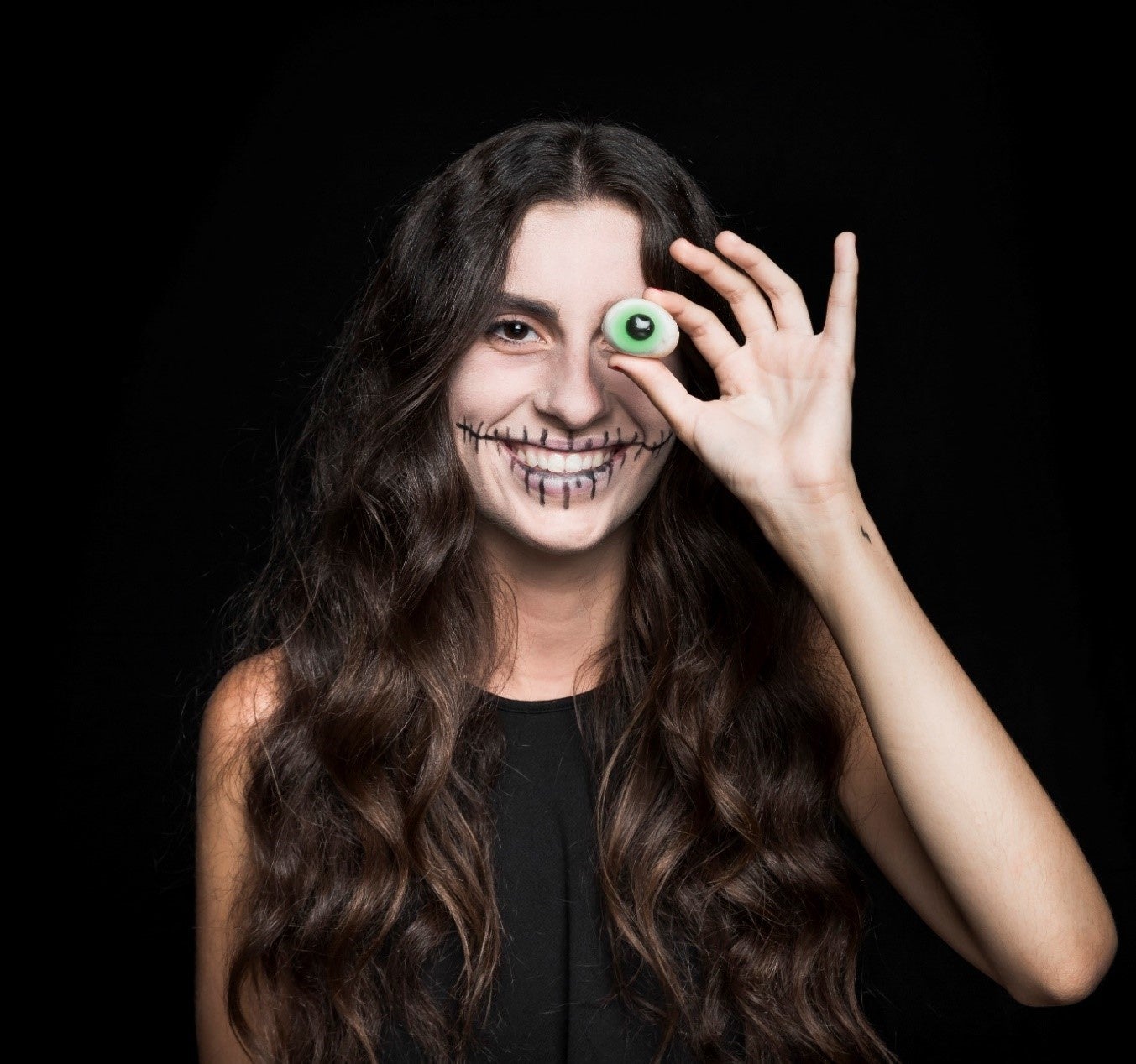 奇抜な色のカラコンで吸血鬼のハローウィンメイクが完成!