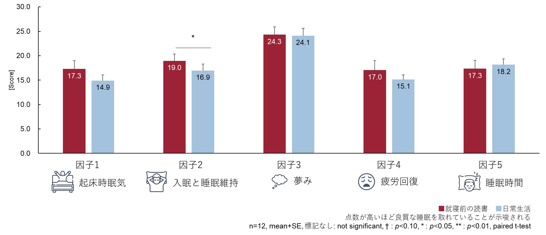 起床時の自身の睡眠を評価する心理尺度であるOSA睡眠調査票を用いたアンケート評価で、睡眠に関する主観的評価を比較しました。以下の5つの睡眠因子のうち、「2.入眠と睡眠維持」において、「就寝前の読書」を行う群が「日常生活」を行う群と比較して、有意に点数が高いことが確認されました。