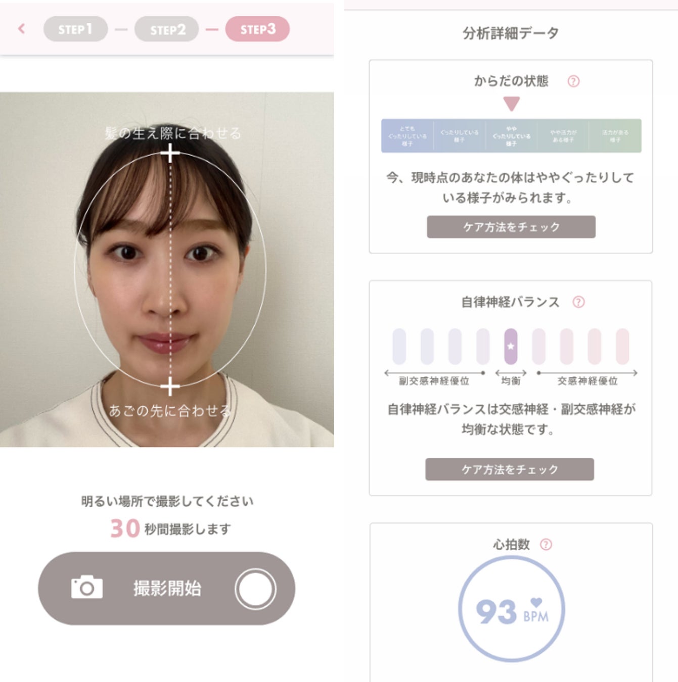 顔の写真を撮ることで、体の疲労傾向度や、心の状態(自律神経バランス)、また心拍数レベルを分析。