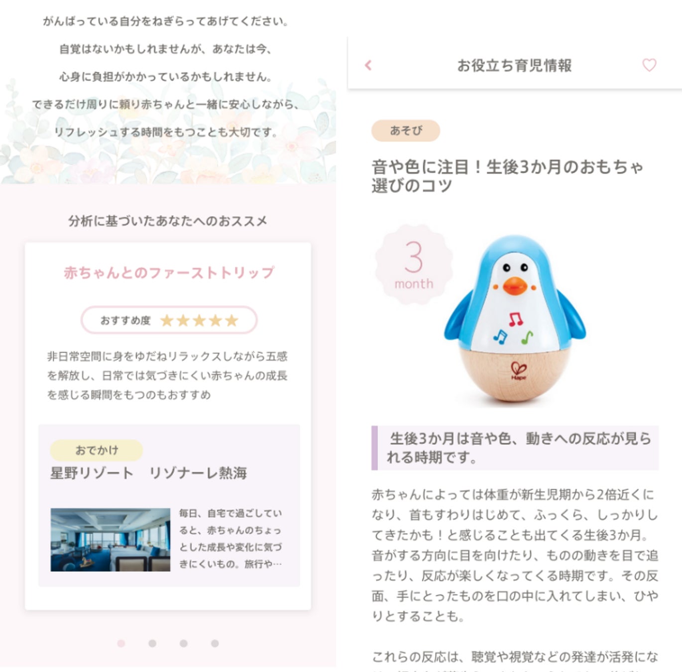 産後特有の悩みを解決するケア方法や、乳幼児ファミリーを手助けするサービス、赤ちゃんとの生活がもっと楽しくなる情報、月齢に合わせた育児情報などが提案されます。