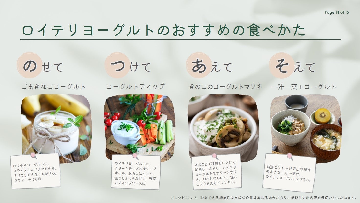 小島先生は、「ロイテリ菌」が配合された「ロイテリヨーグルト」について紹介し、加えてプロバイオティクスとプレバイオティクスを組み合わせたおすすめの食べ方について“のせて” “つけて” “あえて” “そえて”の4つの食べ方を紹介しました。『ヨーグルトは朝、食べるイメージが強いですが、アレンジを加えると料理にも使うことができます。昼ご飯や夜ご飯のおかずとしても楽しんでください。』と4つのレシピを紹介しました。さらに、『ロイテリ菌は空気にとても弱いので、作り置きせずになるべく早く食べるようにしてください。また熱によって死滅してしまうので、加熱せずに生の状態で調理し、生きたままの菌を摂るように心がけてください。』と調理する上での注意事項についても説明しました。