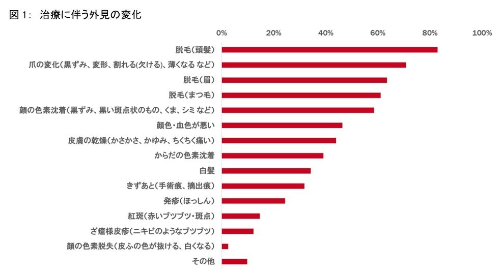 研究に参加した乳がん患者(41名、以下研究参加者)のスキンケア実施頻度は、ほぼ毎日する(85.4%)、外出時や人と会う時(9.8%)、ほとんどしない(4.9%)。メイクアップ頻度は、ほぼ毎日する(23.9%)、外出時や人と会う時(63.4%)、ほとんどしない(7.3%)でした。研究参加者の半数以上が回答した治療に伴う外見変化は、「頭髪の脱毛(82.9%)」、「爪の変化(70.7%)」、「眉毛の脱毛(63.4%)」、「まつ毛の脱毛(61.0%)」、「顔の色素沈着(58.5%)」でした(図1)。